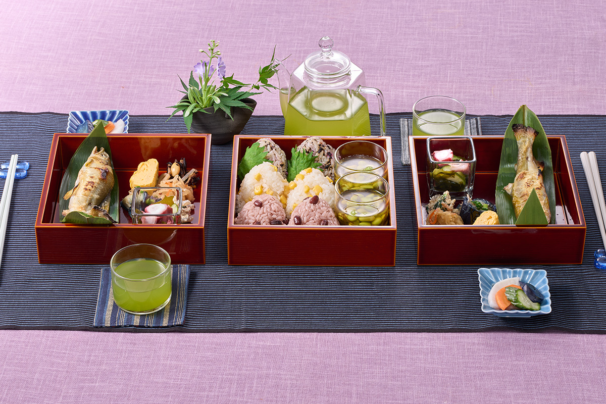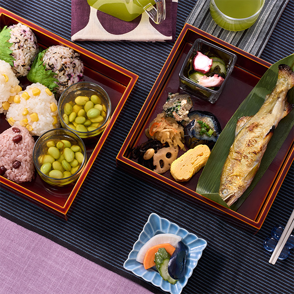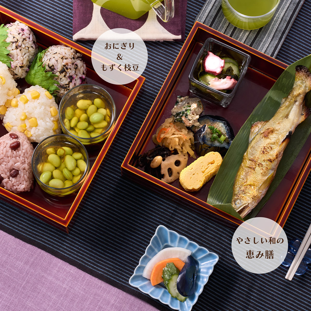 枝豆や雑穀を混ぜたおにぎりに、旬のお惣菜をちょっとずつ。