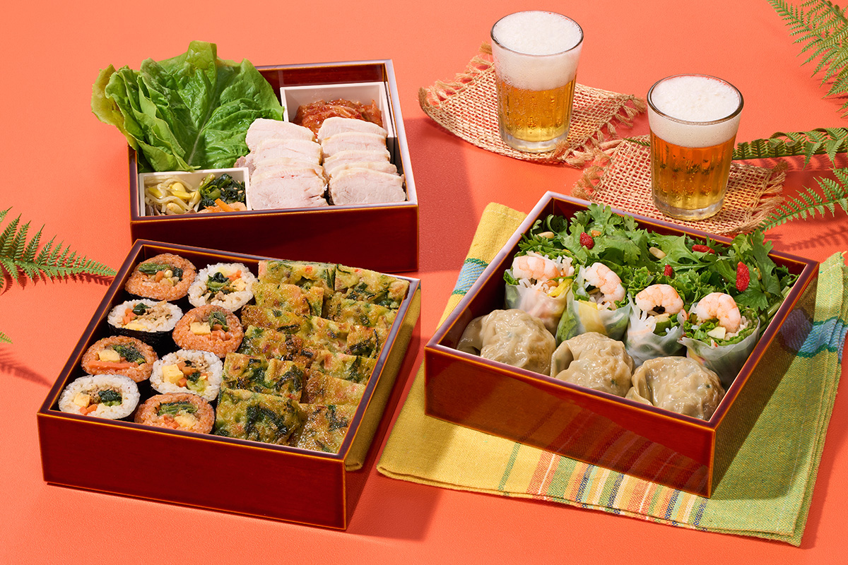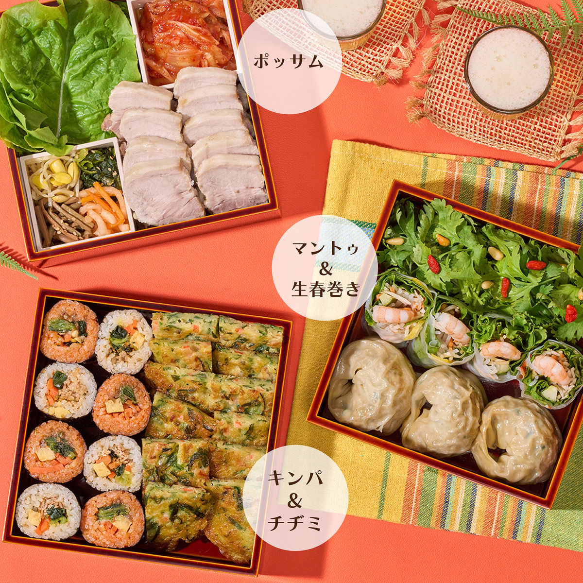 ポッサムやキンパ、チヂミをきらく箱に盛り付ければ、ホームパーティーやおうちごはんが一気に華やぎます。