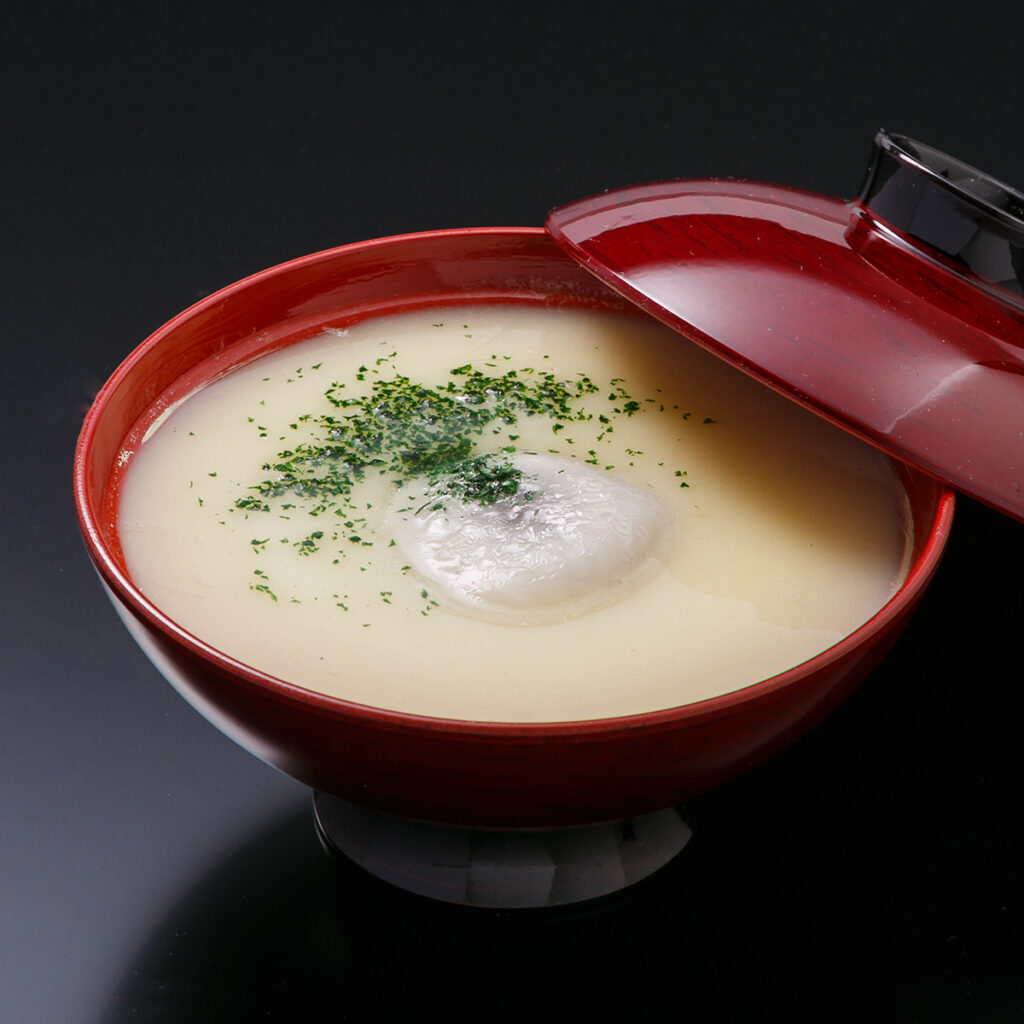 小豆餡餅と白味噌仕立て、ダシは昆布と煮干し。