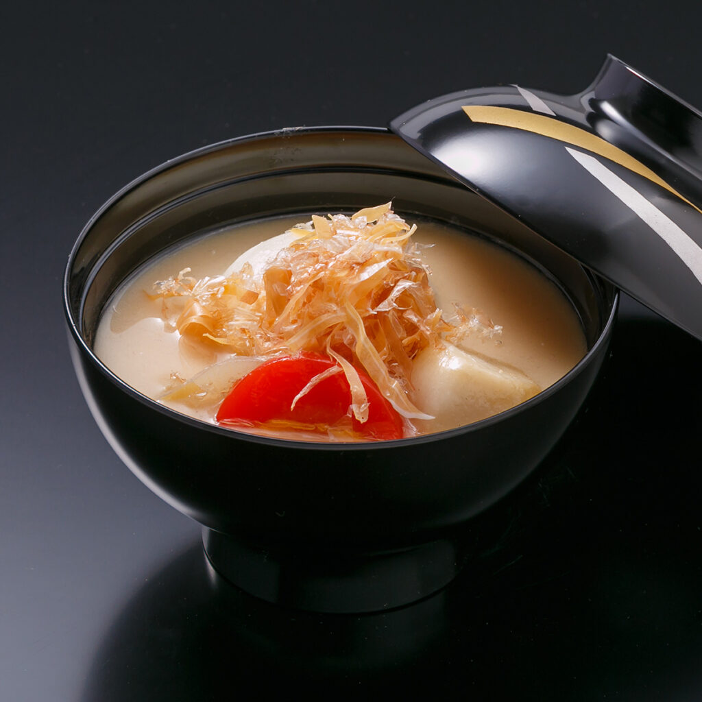 昆布と鰹節でダシをとり、半月切りの大根と皮を剥いた里芋を柔らかく煮て、